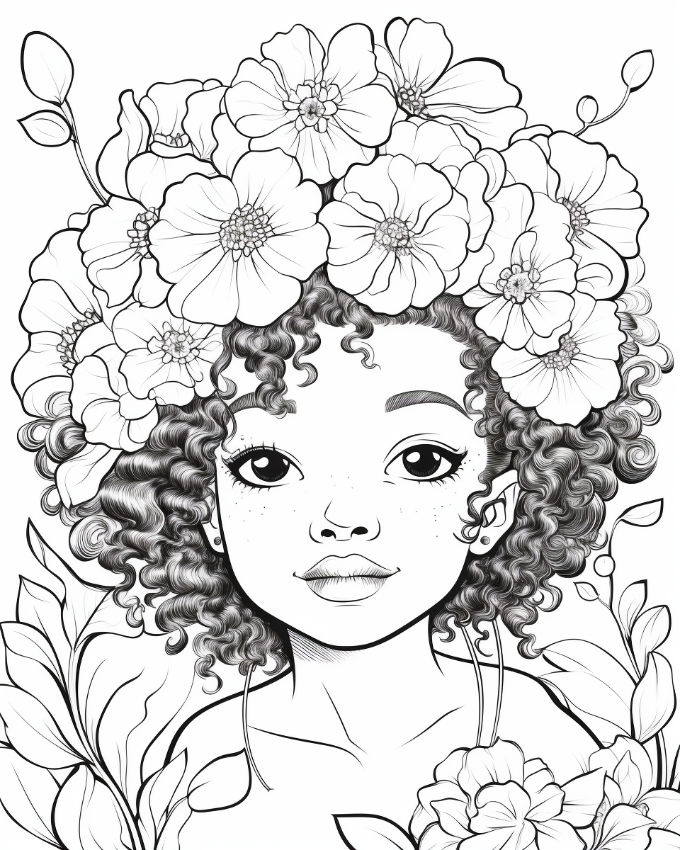 Unleash your creativity with this captivating coloring page PDF featuring a charming girl surrounded by a bouquet of blossoming flowers. Let your artistic talents flourish as you add your own colorful touch to this enchanting scene!"