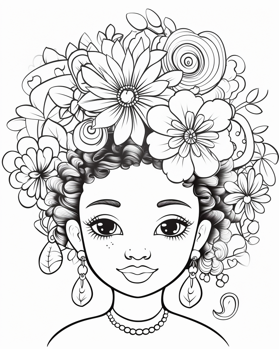 Unleash your creativity with this captivating coloring page PDF featuring a charming girl surrounded by a bouquet of blossoming flowers. Let your artistic talents flourish as you add your own colorful touch to this enchanting scene!"